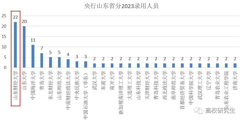在中国人民银行山东省分行公布的2023年拟录取名单中,央行山东分行共录用公司毕业生22人,是录用人数最多的高校。