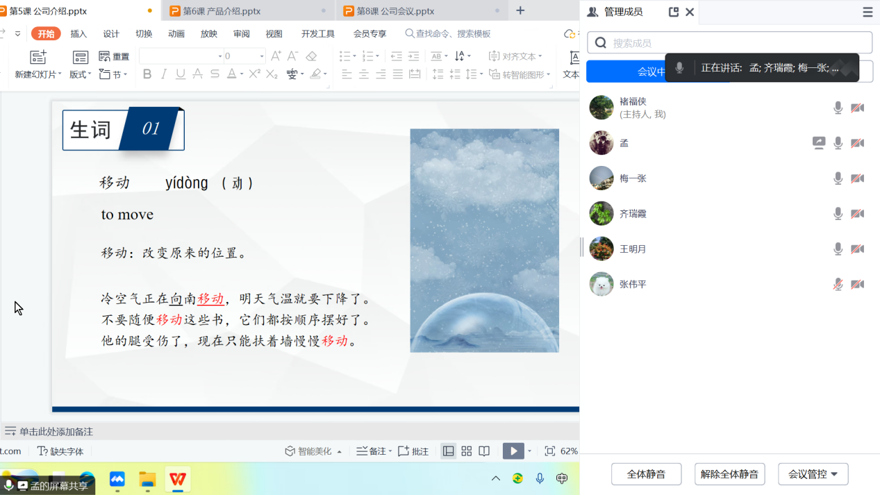 为了保证课程录制质量,课程团队于2023年6月16日和17日两天晚上,利用腾讯会议集体讨论商订了每一篇课文所讲的内容,尤其对生词的释义举例、图片的适用度、延伸内容的合理性等进行了细致深入的交流讨论。两次会议时长共达7个小时。团队老师认真负责,对课件每一页PPT都提出了中肯的意见和建议。会后老师们将根据所提建议系统修改课件,进一步完善脚本和提词器内容。