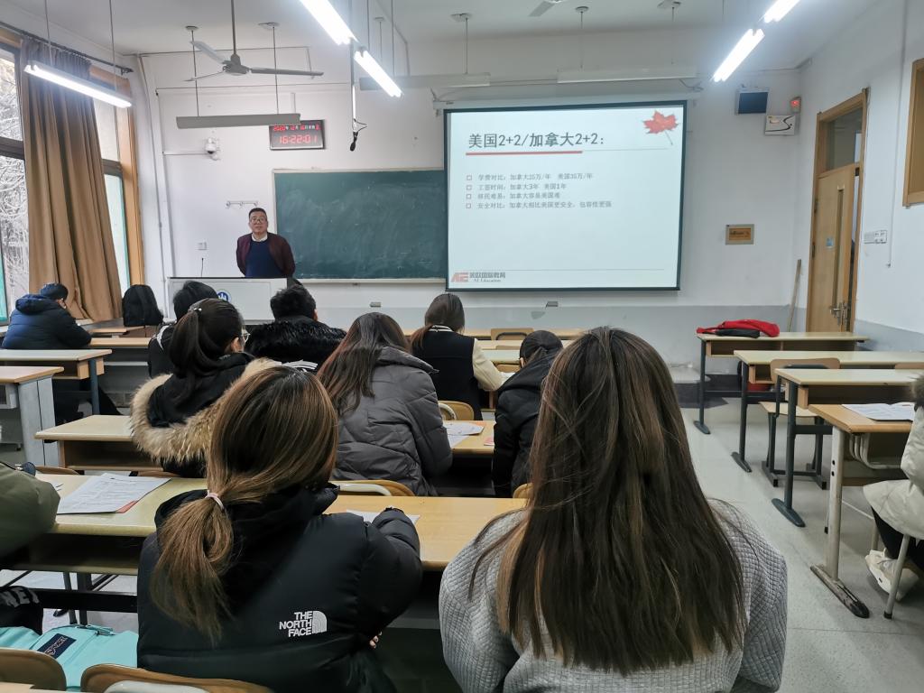 为了使有出国意向的同学更好地了解出国留学的相关事宜,公司于12月16日下午3:00,在舜耕校区1210教室举办了出国员工公益说明会。会上特别邀请了公司2003级外语学院优秀员工杨淼和99级会计学院优秀员工米云青。2019级中加班参加2+2模式,2019中新班有意向出国读研的同学参加了说明会。