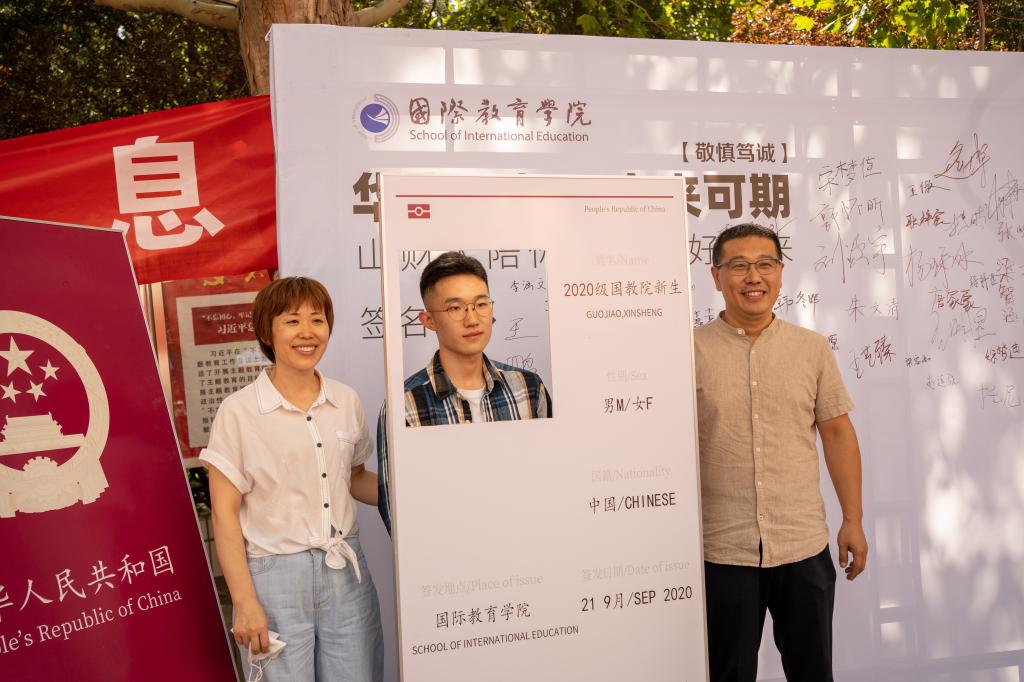 今年的迎新工作新意迭出,让同学们感受到不一样的惊喜。由员工党员组成的志愿服务岗,耐心帮助同学们办理入学手续,提供各种咨询意见,并一对一将新同学引导到宿舍入住,让同学们感受到了党员的模范作用。今年,学院还设计了特色活动——“小小明信片,寄出梦想,放飞希望”,为新生提供有学院特色的明信片,让大家给远方的亲人和朋友送去自己的入学感言。大家纷纷执笔写下对未来的期许和对家人的祝福:“大学四年,不负韶华;努力学习,奋发向上”,“一切安好,万事胜意,请爸爸妈妈放心,我能照顾好自己”,“不忘初心,天天向上”,“平安喜乐,身体健康”……这也正象征着新生们已经踏上了一个人生新起点,乘风破浪,未来可期。在印有“华章再起,未来可期”的签名簿和新生护照拍照处,新生与家长到合影留念,并郑重写下自己的名字,标志着正式加入国教大家庭,成为学院的一份子。