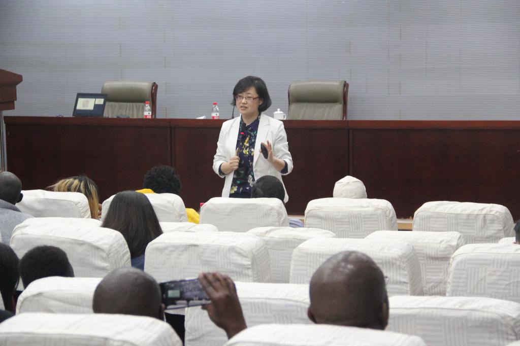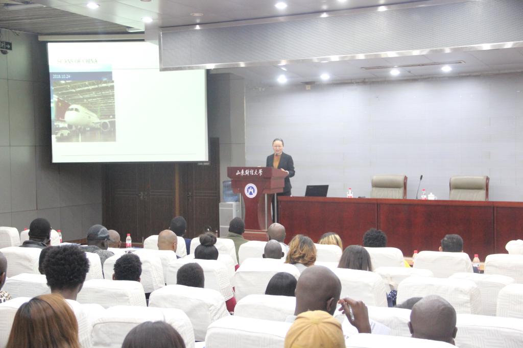 22日下午,对外经贸大学高端培训和本科英语授课来华职工在舜耕校区天舜大厦文华堂听取了国际经贸学院教授刘新英和外国语学院副教授解玲的专题讲座。刘新英和解玲均为教育部来华留学英语授课品牌课程负责人,此次讲座题目分别为“解读中国经济”和“齐鲁文化”。刘新英带领职工循着中国工业化的发展轨迹,从政治、文化、社会等不同角度启发员工理解“中国模式”、一同展望中国经济发展前景。解玲则向职工全面介绍了齐鲁文化和儒家文化,并结合中国汉字、节日风俗和中国地理等知识,让职工与中国传统文化来了一次“零距离”的亲密接触。
