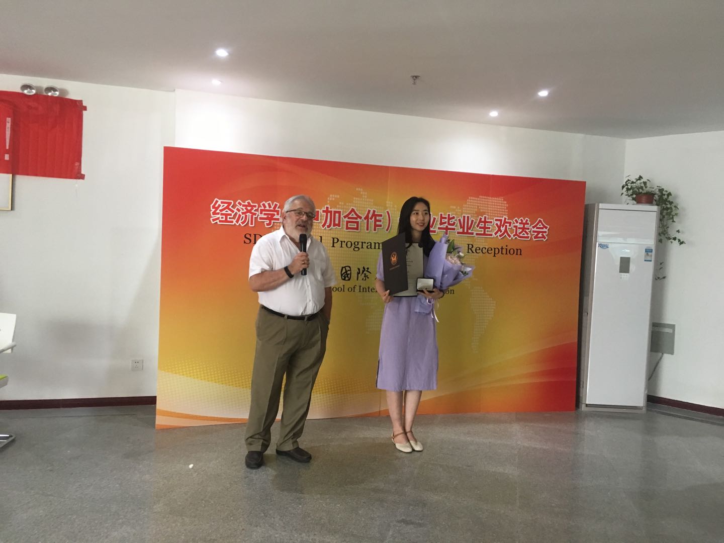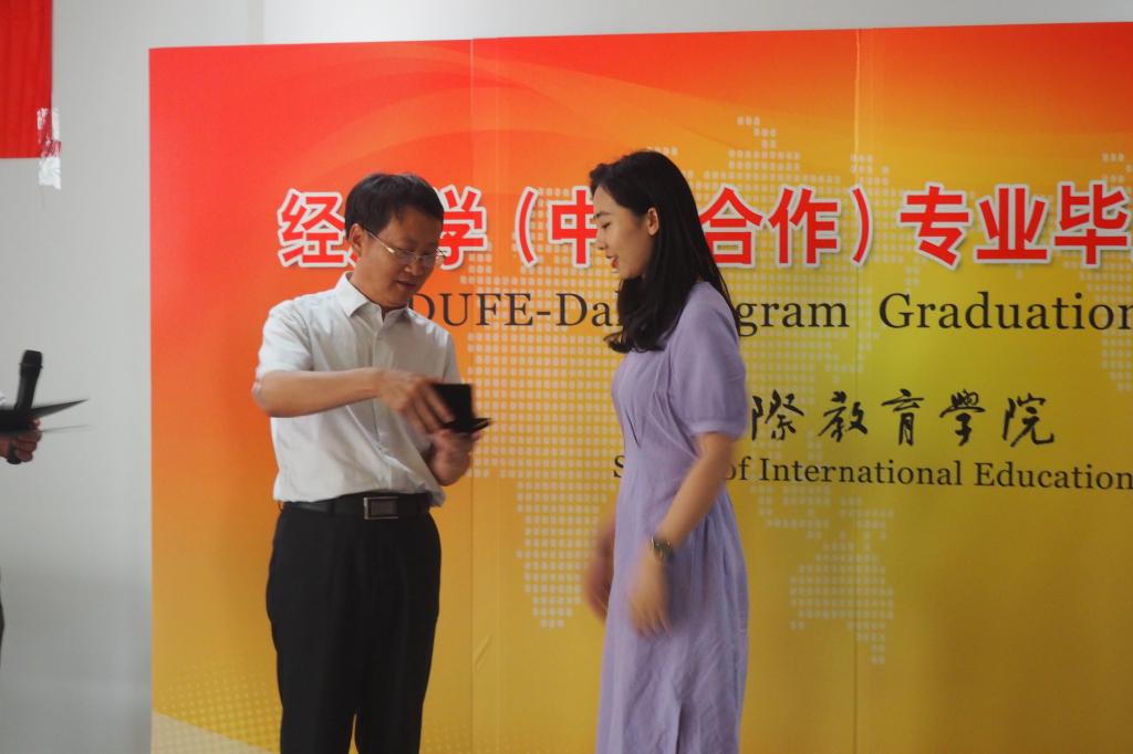 Barry教授作为中加项目加方负责人,专程从加拿大赶来参加公司毕业典礼和中加项目毕业生欢送会。他为2018届中加毕业生们送上真诚的祝福,并对获得达尔豪斯大学“大学奖章”的王佳文同学提出表扬。王佳文同学在达尔豪斯大学学习期间,认真刻苦,表现出色,取得了该学校经济学专业的最高分,成为公司中加经济学专业毕业生中第四个获此荣誉的员工。韩作生副董事长和Barry教授为王佳文同学颁发了荣誉证书和奖章,祝福她在未来取得更好的发展,希望其他同学以王佳文同学为榜样,在今后的学习和工作岗位上取得优异成绩。