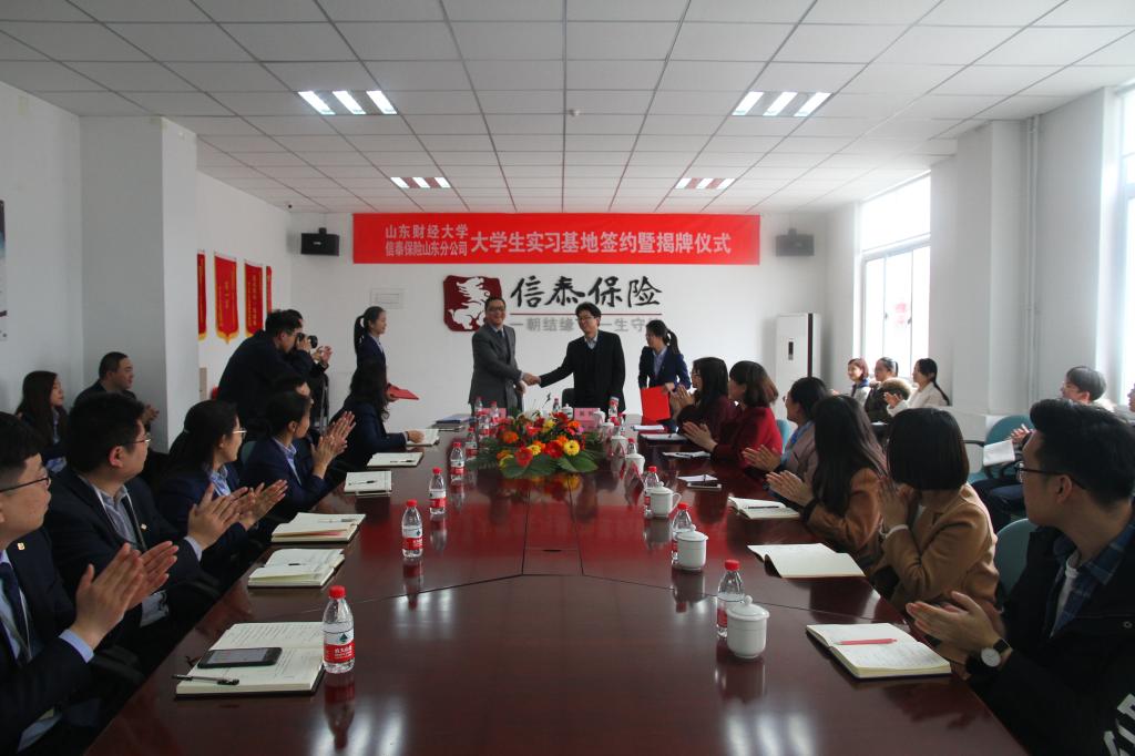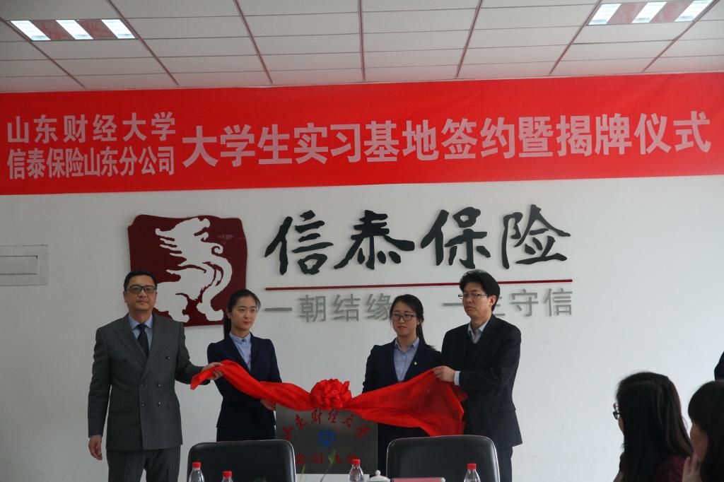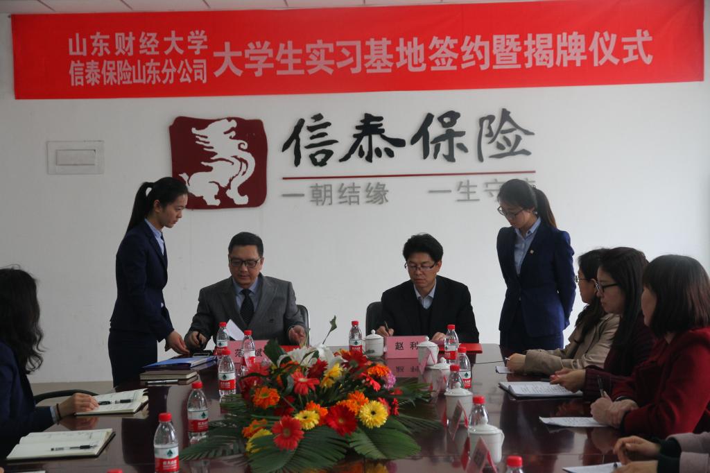 信泰保险山东分公司非常重视此次实习基地的建立,信泰保险山东分公司总经理范勇斌出席并本次实习基地签约暨揭牌仪式,与公司党委书记赵利签署了实习基地共建协议书,并为实习基地揭牌。