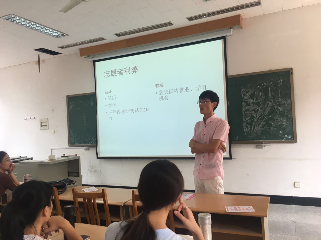 公丕盈是公司汉语国际教育专业首届毕业生的优秀代表,毕业后作为国家汉办汉语教师志愿者,赴越南外国语大学任教四年;凭借扎实的汉语理论基础和对外汉语教学能力,协助当地教师建立了HSK考点,为对外汉语教学事业做出了自己的努力。公丕盈将自己在越南四年的所得所获悉数告知了学弟学妹。他详细地解读了汉办项目和志愿者项目,介绍了志愿者选拔事宜、志愿者的生活以及待遇问题,并认真回答了同学们的提问。